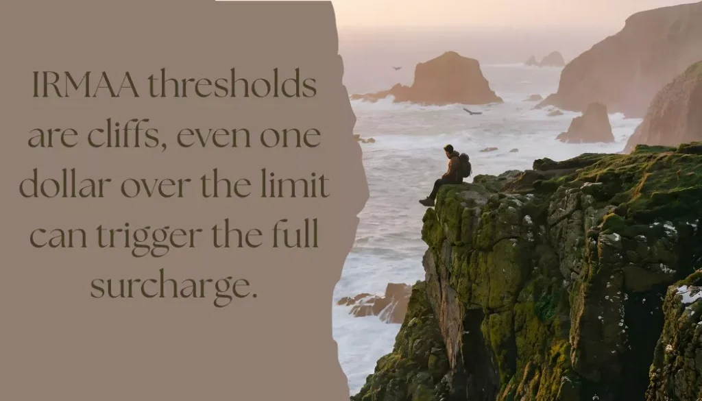 Here’s the critical point: IRMAA thresholds are cliffs. One penny over the limit triggers the full surcharge for that bracket. There is no gradual or blended increase like you see with tax brackets. If you exceed the threshold—even by a dollar—you pay the entire higher amount. This makes careful planning essential.